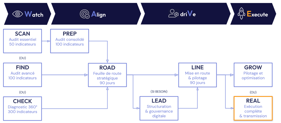 La mission REAL – Accompagnement d’exécution complète s’adresse aux PME e-commerce qui disposent d’un plan clair, mais qui manquent temporairement de ressources pour le déployer efficacement.